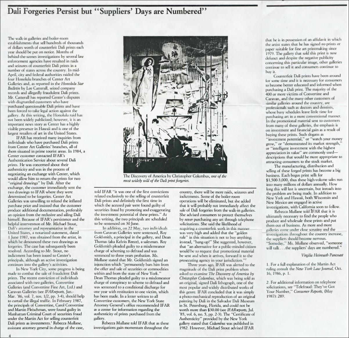 This article does not directly address the issue of bogus Dali prints bearing an authentic Dali signature, but does report on some of the efforts at the time to address the outright forgeries being sold.