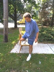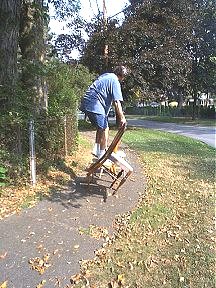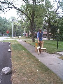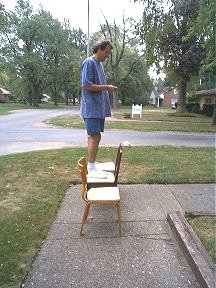 While following this event over the internet, Allen Bukoff (Acting Director, FLUXUS Midwest) remembered how as a young boy he had used a train of chairs to move through the house--without ever touching the floor. On Sunday, 27 September 1998, Allen walked out the front door of his house, carried three chairs to the sidewalk at the end of his block in Birmingham, Michigan, and embarked on his own block-long voyage of discovery and performance. |