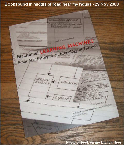 | On Saturday, November 24th, 2003, my wife and I left our house--just before 6pm EST US. We got in my car--I was driving--backed out of our garage, headed down the short driveway, took a right onto the street, and about half way to the corner of Fairfax and Redding--at about 40 feet--I noticed there was something like a catalog or book lying in the middle of the road. Just short of the intersection I pulled the car to a stop, opened my door, reached down, and picked up the following book: Maciunas' LEARNING MACHINES - from Art History to a Chronology of Fluxus. |